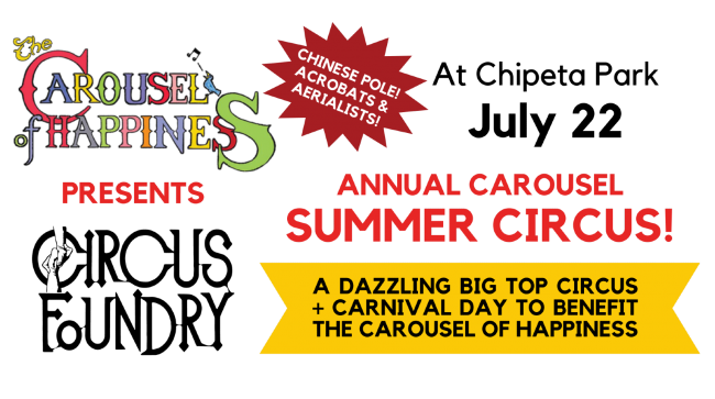 Join us for a big top circus and carnival day to benefit the Carousel! Carnival noon to 4pm, with a silent auction, concessions, $1 games. Purchase your Circus Show Tickets in Advance! Family show at 2pm and an Adult show at 7pm, including live auction of fabulous vacation packages.