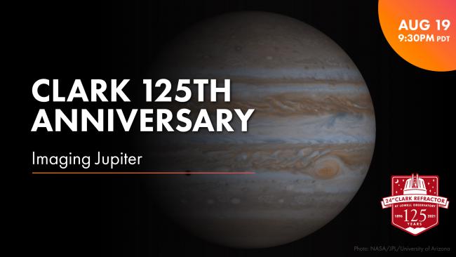 Join us for a Livestream celebration of the 125th anniversary of the historic Clark Refractor! The program runs from 9:30-10:15 pm PDT and includes: - Lowell Historian Kevin Schindler will discuss historic instruments used on the Clark for imaging: cameras, spectrograph, comet eyepiece, etc. - Lowell educators at the Clark Refractor will share live views of the planet Jupiter, which Percival Lowell and EC Slipher imaged more than a century ago. - Lowell Astronomer Dr. Phil Massey will join Schindler to compare these historic techniques to those of today, with special attention on the Lowell Discovery Telescope’s Large Monolithic Imager.