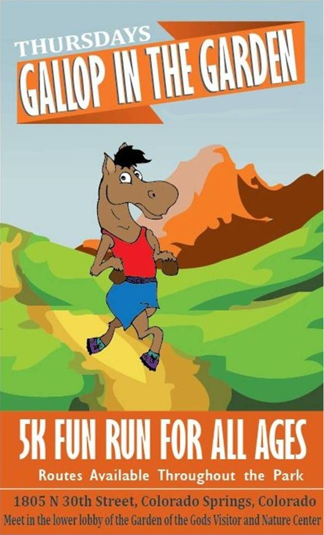 Join us every Thursday between 3:00pm and 5:00pm (times vary on/off-season) for the Gallop in the Garden 5K Fun Run! Meet in the lower lobby of the Garden of the Gods Visitor & Nature Center at 1805 N. 30th St., Colorado Springs, CO. We’ve mapped out some phenomenal routes through Garden of the Gods Park and Rock Ledge Ranch that start and end at the Visitor & Nature Center.