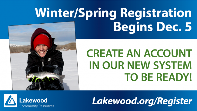 Registration for the winter-spring programs beginning on Dec. 5 for residents and Dec. 7 for nonresidents. To create an account, visit www.Lakewood.org/Register. Users who create their account in November will be automatically entered to win recreation passes and a Bear Creek Lake Park Annual Pass.