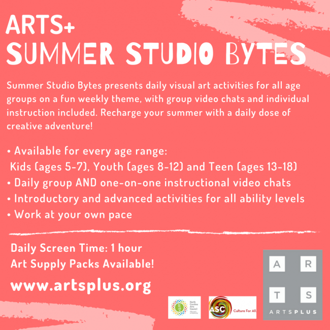 This summer Arts+ offers a new online twist to staying creative, “Summer Studio Bytes”. These daily activities are designed to keep kids of all ages engaged and excited about learning new visual art techniques and sharing their work in a fun, inviting, collective online studio. Each week participants receive four new visual art activity sheets, delivered directly to your inbox, covering a wide range of media, including drawing, painting, printmaking, paper sculpture, bookmaking, comics, and character design. And every weekday, our faculty of teaching artists will be available on group and individual video chat to guide you through projects, step by step. For a small additional fee, our Art Supply Packs will set you up with all the paint, ink, brushes, and special materials you need to complete each project in the series.