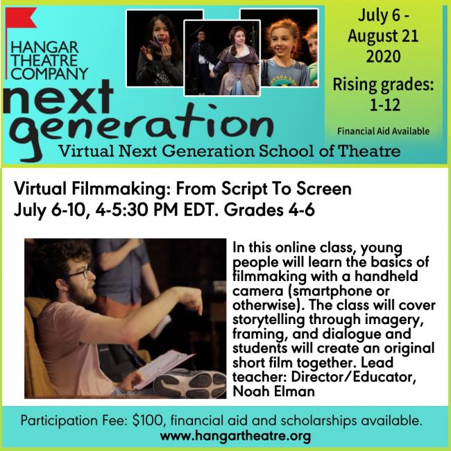 7/6-7/10 Virtual Filmmaking: From Script to Screen Grade 4-6 M-F: 4-5:30pm In this online class, young people will learn the basics of filmmaking with a handheld camera (smartphone or otherwise). The class will cover storytelling through imagery, framing, and dialogue and students will create an original short film together. $100